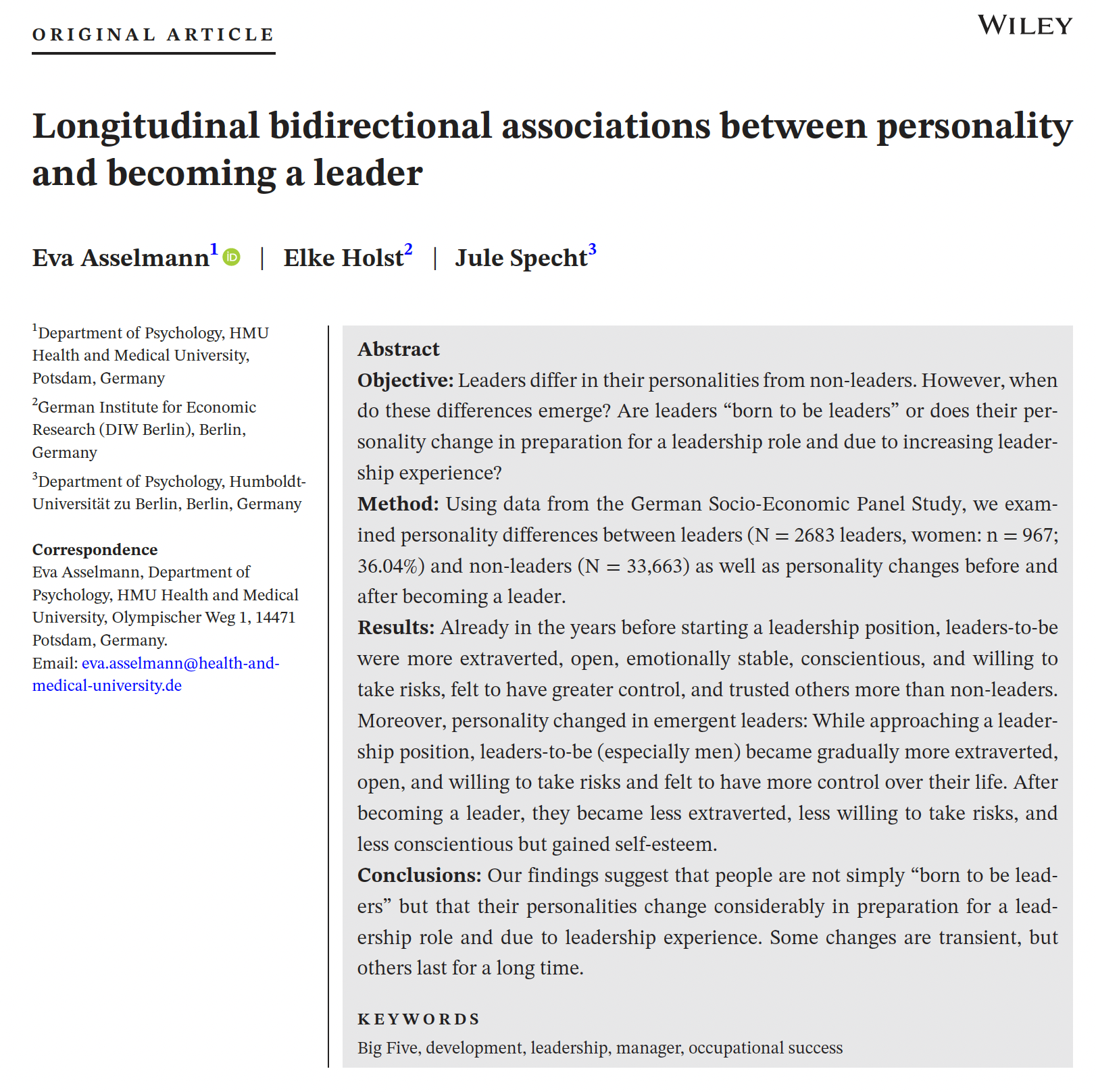 Method: Using data from the German Socio-Economic Panel Study, we examined personality differences between leaders (N = 2683 leaders, women: n = 967; 36.04%) and non-leaders (N = 33,663) as well as personality changes before and after becoming a leader.